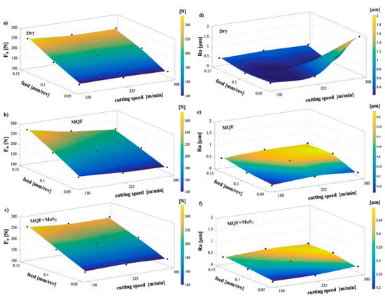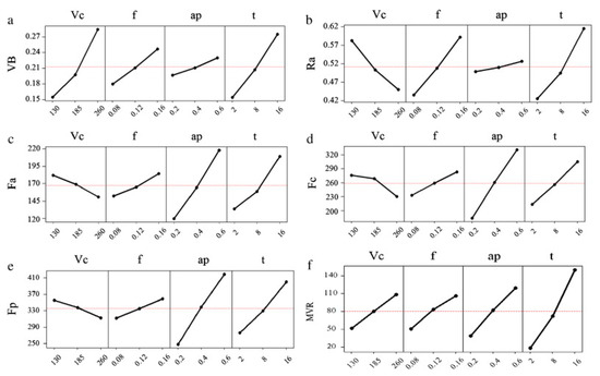 Influence of cutting parameters on (a) Flank wear, VB (b) surface roughness, Ra (c) axial force, Fa (d) cutting force, Fc (e) radial force, Fp (f) material removal rate, MRR [39].