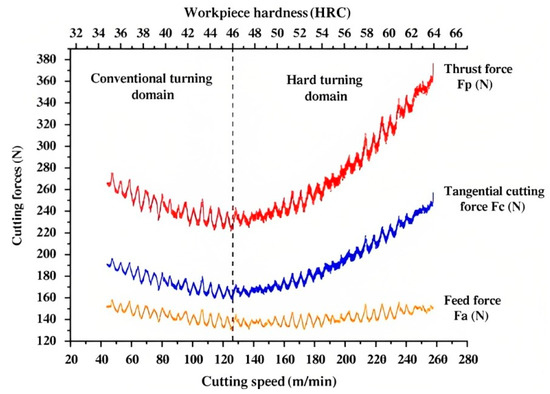 Influence of workpiece hardness and cutting speed on components of turning force at fixed feed = 0.08 mm/rev and fixed depth of cut = 0.3 mm cutting conditions [45].