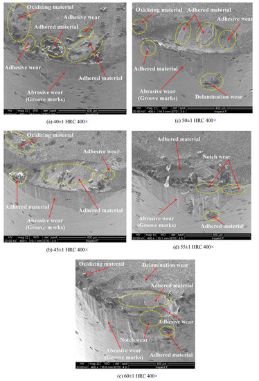 Tool wear images obtained in dry hard turning at different hardness levels [57].