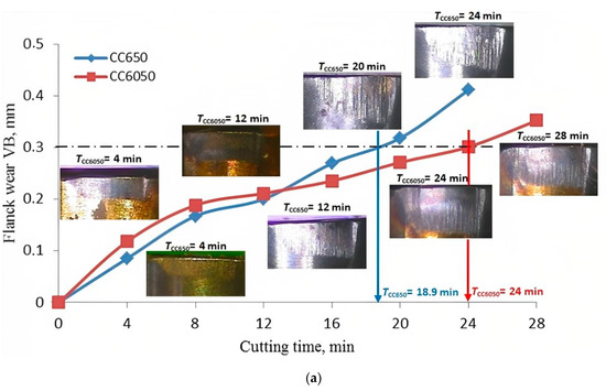 In the manufacturing sector, ceramic cutting tools are used for the machining of various hard materials. High melting points, great hardness, and outstanding wear resistance are all characteristics of ceramics. According to Basak et al. [63], to get 0.8 µm of turned work surface roughness of AISI D2 alloy steel with the ceramic tool, the speed of machining should be 220 m/min, while to get a supreme rate of production, the tool-feed should be taken from 0.11 to 0.15 mm/rev. Lima et al. [64] found improved surface quality in the tuning of AISI D2 steel (58 HRC) with coated carbide, PCBN, and ceramic cutting inserts compared to cylindrical grinding. Flank wear seemed to be improved with cutting speed along with the depth of cut. Salem et al. [65] observed a saw tooth profile of chips in the orthogonal cutting of an AISI D2 work-specimen with a ceramic insert, and it occurred due to crack propagation in the quenched structure of the material. Due to the increase in cutting speed, the chips became soft and ductile; however, segmentation of the chips took place and looked similar to a saw-tooth pattern on the chips. Yuan et al. [66] examined the wear characteristics of an alumina mixed uncoated ceramic insert at diverse cutting speeds during the turning of hardened AISI D2 work-specimens and noticed tribofilm generation at the friction surface, which directly affects the tool life. Davim and Figueira [67,68] inspected the machining indicators of AISI D2 hardened alloy steel using ceramic tools. Tool wear was extremely sensitive to changes in cutting speed and time. Wear at insert surface was rapidly increased with growing speed and turning time. Kamely and Noordin [69] studied microstructure, residual stress, and the development of a white layer during the cutting of AISI D2 work specimens with a coated PVD ceramic cutting insert. The microstructure was changed due to metallurgical alteration and chemical phenomena that happened due to elevated cutting temperatures. Bensouilah et al. [70] conducted hard-turning experiments on AISI D3 hardened steel (63 HRC) using coated and uncoated ceramic tools. The tool life and surface roughness were measured with growth in machining time, and the results are shown graphically in Figure 10a,b, respectively. With a wear limit of 0.3 mm, the tool service life with the uncoated ceramic tool was 18.9 min while it was 24 min for the coated tool. The amount of flank wear significantly impacted the surface roughness. The estimated roughness of coated and untreated tools at the end of their useful lives was 1.37 and 1.46 microns, respectively.