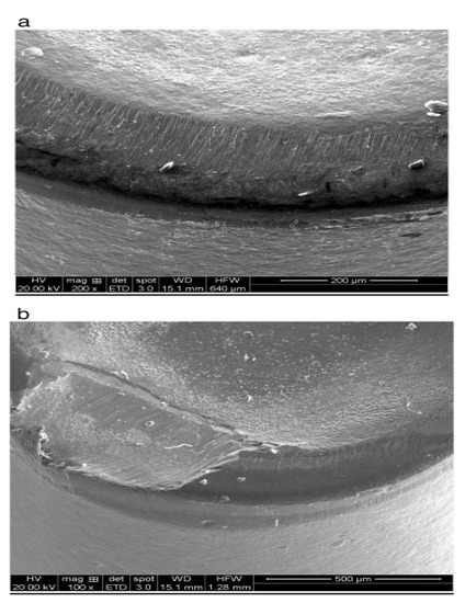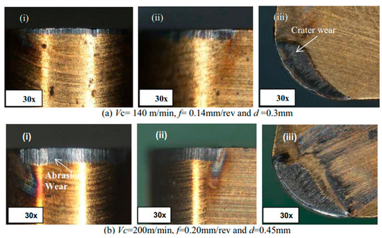 Zeghni and Hashmi [99] found a higher wear resistance capability of coated substrates compared to uncoated substrates, whereas TiC introduced greater wear resistance in relation to TiN coating in the course of turning AISI D2 as well as AISI D3 grade steels. Haron et al. [100] stated that the coated tool outperformed compared to the uncoated in terms of wear during the turning of the 95 MnCrW1 steel bar. Smooth growth of wear was noticed with the coated tool, while the wear zone was concentrated on the tool-tip region. For coated tools, chipping was noticed at the end of the tool’s life. The chips’ color varied with tool wear and cutting speed.