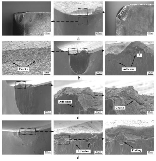 TMWNC tool wear images at diverse cutting speeds (a) 150 m/min, (b) 175 m/min, (c) 200 m/min and (d) 225 m/min [81].