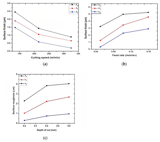 Graph shows surface roughness with respect to (a) cutting speed (b) Feed rate (c) depth of cut [95].