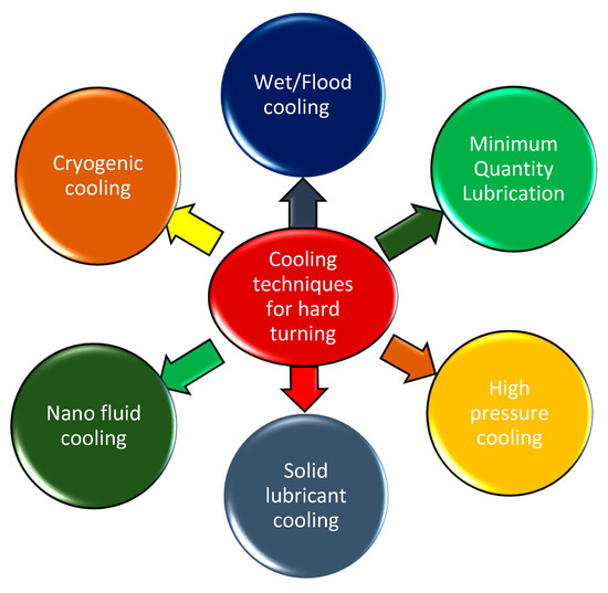 Dry hard turning has certain limitations, such as higher cutting temperatures, fast tool wear, reduced surface finish, high cutting forces, high stresses, high power consumption, etc. Therefore, lots of works using different coolant/cooling techniques have been done till date to improve the hard machining machinability. This section presents a review of hard machining under different cooling and lubrication conditions. Figure 17 depicts the various cooling techniques used in hard-turning machining.