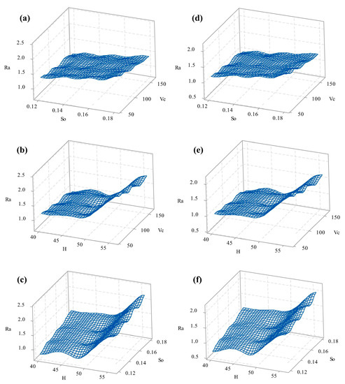 Sahoo and Sahoo [3] accomplished a comparative evaluation of the dry-machining performance of (TiN/TiCN/Al2O3/TiN) coated carbide with an uncoated tool. The observed growth of wear width at the flank face for the coated tool was uniform with no immature failure, whereas abrasion was noticed to be the principal wear mechanism. Sahoo and Sahoo [4] emphasized surface finish, wear of the tool flank, chip formation, and machining forces while turning the AISI 4340 rods by using uncoated and coated carbide cutting inserts. The tool life of coated tools was found to be very high in comparison to uncoated tools. Compared to the uncoated tools, better surface finish and lower machining costs were achieved during turning with a coated tool. Srithar et al. [94,95] found diminished quality of the surface with rising depth-of-cut and cutting feed, while it was improved with rising cutting speed. The forces developed seemed to improve with speed, whereas a subsequent decrement was noticed with the rise in cutting feed. Cutting feed was traced to be the greatest influencing agent for forces and surface quality in machining on an AISI D2 work-specimen with a coated carbide cutting tool. The graph depicts various surface roughness characteristics in relation to cutting speed, depth of cut, and feed rate, as shown in Figure 15. The curve for surface roughness parameters with regard to cutting speed is shown in Figure 15a. The graphs indicate that when the cutting speed increases, the surface roughness parameter decreases. The graph for surface roughness with relation to feed rate is shown in Figure 15b. The graph clearly demonstrates that when the feed rate increases, the surface roughness parameter values increase. Furthermore, when the other factors are taken into account, the experimental findings indicate that the impact of feed rate on the surface roughness parameter is greater. Figure 15c illustrates a graph of surface roughness factors as a function of cut depth. The surface roughness parameter value increases as the depth of cut rises from 0.2 to 0.6 mm, according to the graph. Silva et al. [96] presented the larger magnitudes of cutting as well as thrust forces in the turning of AISI D2 steel with an uncoated carbide cutting tool due to its greater tensile strength and hardness. The sharp increment in cutting force was noticed with the cutting feed. Sahoo [97] applied a titanium nitride-coated tool in turning of heat-treated AISI D2 steel and noticed the acceptable quality of the work surface within the accepted limit of 1.6 microns. Higher speed is attributed to the improved quality of the finish due to the absence of BUE at higher speed. Jiang et al. [98] introduced the simulation approach to validate the obtained simulated results with the results obtained during the turning of an AISI D2 work specimen with a coated (TiAlN) carbide cutting tool. Maximum shear stress between the coated layer and substrate of the tool was improved with cutting speed, while the effect of feeding was very minute. The thrust force was enhanced by the feed rate. Due to the increased deformation degree of the saw tooth chip, the thrust forces at a cutting speed of 90 m/min are greater than those at a cutting speed of 60 m/min.
