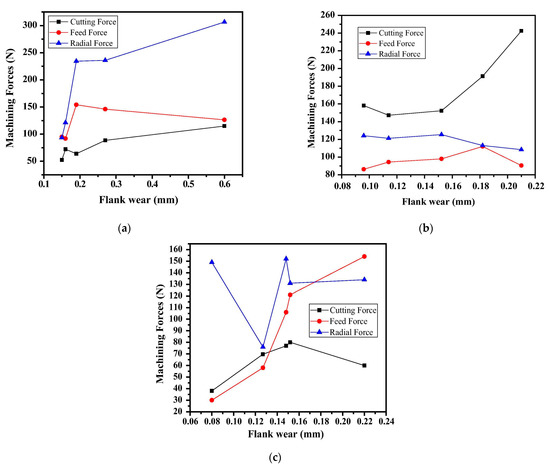 According to Selvaraj et al. [101], the tool wear was dominated by abrasion during turning on duplex stainless steel with a coated (TiC and TiCN) carbide cutting insert at lower cutting speeds, but when turning was carried out at higher speeds, mechanisms such as diffusion, thermal softening, and notching were most prominent. Chinchanikar and Choudhury [102,103] reported that the tool wear directly influenced the radial as well as feed forces in tuning an AISI 4340 work-specimen with PVD and CVD cutting tools. Rapid wear, as well as catastrophic breakage of the tool, was more dominant for the PVD tools whereas gradual progress of wear was noticed for the CVD tool.