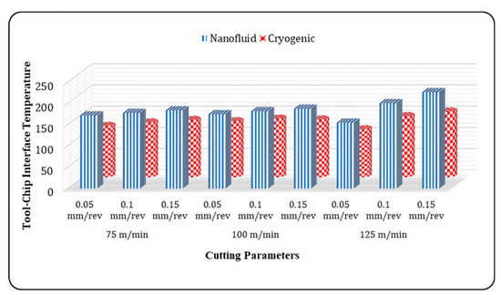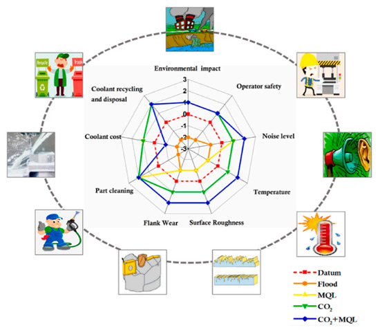 Flood/wet cooling is completely unsuitable for hard machining work because it is unsustainable and adds an extra financial burden to the machinist for the disposal and upkeep of the used fluids. In fact, statistics showed that in the United States, about 155 million gallons of used coolants were released into the open environment [11]. Cutting fluids’ airborne particles negatively affect a number of chronic human health conditions, including asthma, allergic reactions, skin rashes, and dermatological issues [11]. Furthermore, cleaning cutting fluids adds time and expense and has a negative impact on the environment. As a result, excessive use of flood lubrication should be avoided or reduced. Low-viscosity, water-based cutting fluids may therefore be an appropriate technique for simplicity in cleaning. Consequently, there is a constant search for alternative solutions that reduce environmental problems.