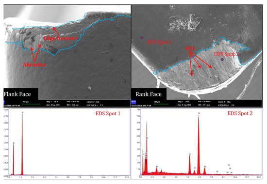 Sahin [46] emphasized a comparison of tool life between ceramics and cubic boron nitride inserts using the Taguchi method. CBN cutting tools outperformed ceramic tools for undercutting AISI 52100 steel. Cutting speed had the greatest influence on wear at the insert surface, followed by insert hardness and rate of feed. Dureja et al. [47] characterized the wear mechanisms of inserts in turning an AISI H11 hard work-specimen with a coated (TiN) CBN cutting insert. Machining with lower speed and feed causes abrasion wear, whereas machining with high speed causes adhesive wear due to tribo-chemical action between tool and workpiece. The built-up edges were formed at a medium cutting speed. Ghani et al. [48] deliberated on the tool wear and heat partition on turning of an AISI H13 work-specimen with a CBN cutting insert and established that the wear on the tooltip was highly dependent on the intensity of the temperature evolved in cutting and the amount of heat conceded by the insert during high-speed turning. Higher temperatures reduce the bonding strength of the cutting tool, resulting in tooltip chipping or shearing-off failure. Due to the high speed, the contact area was reduced, which shifted the maximum temperature and stress zone to the cutting edge. However, greater crater wear and concentrated plastic deformation took place on the tool edge. More et al. [49] carried out the cost analysis during the turning process, which revealed the lower cost of machining with the CBN tool compared to PCBN and showed that it can be used as a substitute tool for PCBN in the turning of hardened AISI 4340 work-specimens. Morehead and Huang [50] observed segmental as well as continuous chips with saw tooth profiles in the machining of AISI 52100 steel with the CBN tool. The spacing between two adjacent saw teeth and the height of the segmental chip were reduced with tool wear growth, whereas for the continuous chip, it was increased with tool wear. Niaki et al. [51] investigated hardened AISI 4340 steel using CBN inserts with various cutting edges to find out the responses such as tool wear, cutting force, and surface roughness. It was observed that the stability of the CBN cutting was the initial factor in the determination of the tool’s life. CBN tools of grades A and B provided a 60% improvement in tool life and inferior tool wear in comparison to CBN tools grade C. Suarez et al. [52] performed a machining operation on hardened AISI D6 material with a PCBN tool under various cooling environments to determine the effects of tool wear, quality of the surface, tool life, and cutting force. According to reports, MQF + MoS2 provides longer tool life than MQF alone. Figure 8 depicts the wear pattern of the PCBN tool in dry machining. Different-sized abrasion marks and micro-chipping on the tooltip were seen in Figure 8. At the beginning of the machining process, the tool edge radius encountered a micro-chipping structure. Further spreading in the direction of wear that was preferred caused a localized increase in machining force, resulting in large abrasive markings on the tooltip.