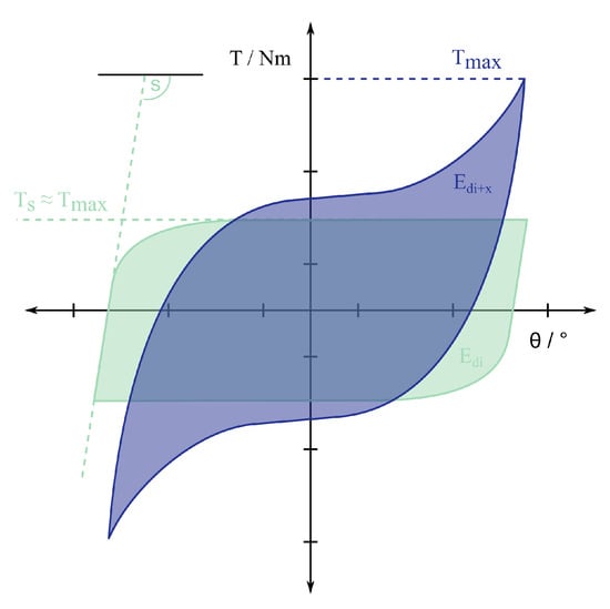 Two exemplary torque curves that can qualitatively arise during the experiments. In green, the torque curve of the undamaged bearing, which corresponds to the model curve set up according to Dahl with the slope s and the steady-state torque , is shown. The qualitative torque at an advanced damage formation is shown in blue. The area of the curves (green) and (blue), shown in transparent colors, correspond to the dissipated energy for the respective oscillation cycle.