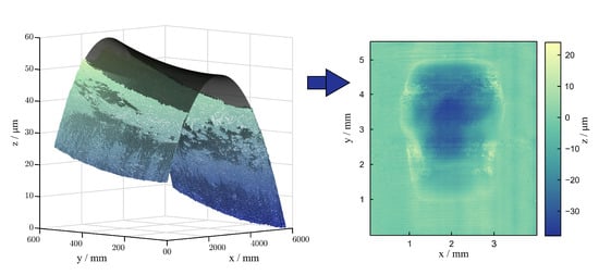 A laser scanning microscope is used to determine the worn material volume on the bearing raceway surface. To calculate the wear volume of the 7208 bearings, a topographical image of the whole wear mark with the surrounding non-worn areas is acquired. The non-worn areas are interpolated with second-degree functions to create a model of the original raceway surface. By subtracting the worn surface from the original surface, a difference image is created from which the worn volume of a damage mark is determined, as can be seen in Figure 4.