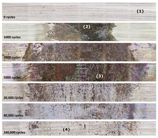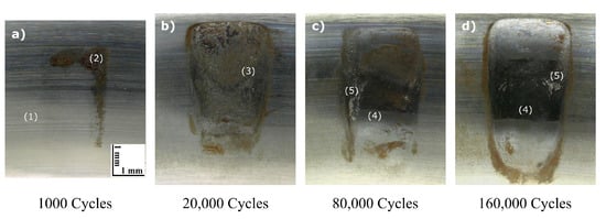 To show how the damage marks on the inner raceway of the bearings are developing, Figure 5 shows the representative damage marks after different cycle counts. Figure 5a shows a contact area with corrosive wear starting after 1000 cycles (2). At this cycle count, most contact areas are not showing signs of severe wear, whilst others such as the one in the figure are partly showing corrosive wear. It should be noted at this point that no elemental analysis was performed to prove that these are indeed corrosion products. However, it has long been known from the literature that the reddish brown and black discolorations in the oscillating steel–steel contact are corrosion products such as hematite and magnetite [,,]. After 20,000 cycles (Figure 5b), every contact area shows severe damage that has spread over the entire area swept by the rolling elements. In the damage mark, smaller micropitts (3) and, as a result, a rough-looking surface can be observed. In addition, reddish-brown and blackish-brown corrosive products are visible. At a more advanced stage, after 80,000 cycles, the damage pattern shown in Figure 5c appears. Some parts of the wear mark still appear reddish-brown and on the left side at middle height a bigger material spall can be observed (5). It is also noticeable that large parts of the damage mark have been smoothed and have a mirror-like appearance (4). After 160,000 cycles (Figure 5d), as after 80,000 cycles, a material spall is found on the right side of the mark at mid-height. Almost no corrosive products can be seen in the damage mark; these are only found in the outline of the mark. At this point, the entire ground of the damage mark almost appears to be polished and has a mirror-like appearance.