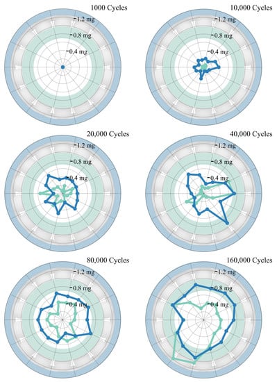The wear volumes of the individual wear marks are shown in Figure 6. For each bearing examined after a defined number of cycles, a corresponding polar plot is shown, divided into 14 segments and corresponding to the number of rolling elements. The mass loss of the marks on the inner ring is shown in green and the mass loss of the marks on the outer ring at the respective position on the bearing ring is shown in blue. The mass loss is determined by the measured wear volume and the density of 100Cr6 of . After 1000 cycles, most of the marks are still undamaged and almost no macroscopic wear can be determined with the applied method. After 10,000 cycles, a clear increase in mass loss can be seen, especially on the outer ring. It is also clear that all marks around the circumference of the bearing show macroscopic wear, but the wear was not uniform across all the damage marks. While some marks already show a mass loss of 0.4 mg, other contact points lost less than 0.2 mg. The mass loss on the inner ring is still significantly lower than on the outer ring. After 20,000 cycles, a significant increase in mass loss can also be recorded on the inner ring. Here, the difference between the individual wear marks is even more noticeable. While individual marks show less than 0.1 mg, one wear mark already has a mass loss of 0.6 mg. As expected, the mass loss continues to increase with an increasing number of cycles and reaches its maximum at 160,000 cycles, which corresponds to the maximum number of tested cycles. Here, a maximum of approximately 1.2 mg per mark is measured on the inner ring.