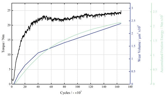 In order to establish a connection between the wear volume and torque, the progression of the maximum torque per oscillation cycle (black), the summed wear volume on the bearing raceway (blue), and the summed frictional energy are all shown versus the number of cycles in Figure 8. The course of the maximum torque starts at a low value of less than 2 Nm. After approximately 3000 cycles, the torque starts to increase steeply and reaches a local maximum value of approximately 23 Nm after approximately 50,000 cycles. Up to the end of the test at 160,000 cycles, the torque remains almost constant in the further course and only increases by approximately 1 Nm. The green curve in Figure 8 shows the accumulated dissipated energy, which results from the torque curves as described in Section 2.2. The frictional energy shows a degressive behavior, unlike what one would expect from the maximum torque. At this point, it is important to take a closer look at the shape of the torque curves over the number of cycles. This is because, even if the maximum torque remains at an almost constantly high level towards the end of the test, the enclosed area within the torque curves decreases from a certain point in time onward.