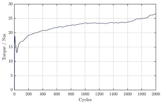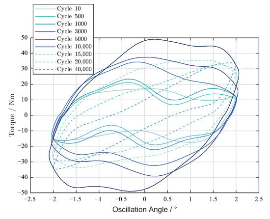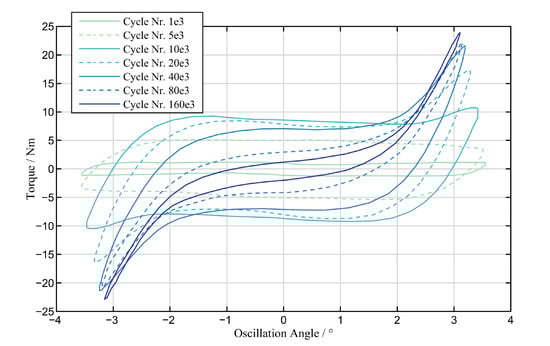 Figure 15 shows the torque signal plotted over the oscillation angle at different numbers of cycles during the same test as that in Figure 13. The oscillating movement with an oscillation angle of was carried out at a mean oscillation angle of with a sinusoidal characteristic. Hence, the turning points of the movements are at and and the position is characterized by the highest rolling speed of approximately . Starting with the first cycles, the characteristic of the torque curve changes. Between 10 and 10,000 cycles, the torque signal rises noticeably at the position where the speed is at its highest value. In addition, the torque level at the turning points also increases with more cycles leading to an overall larger area and the wider appearance of the torque curve. From 10,000 cycles on, the shape of the torque curve changes its characteristics again. The torqu e level at high speeds seems to decrease, whereas the torque level at the turning points is increases even further.