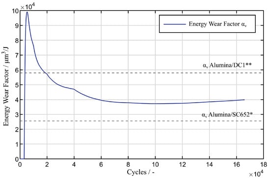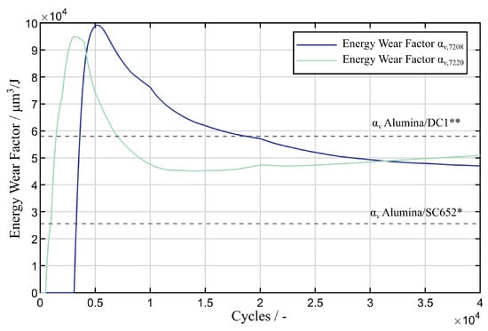 Comparisonof the curves of the energy wear factors for the tests with bearing type 7208 (green) and 7220 (blue). * Energy wear factor for an Alumina/SC652 contact in the oscillating ball–disk test under pure sliding found in []. ** Energy wear factor for an Alumina/DC1 contact in the oscillating ball-on-disc test with pure sliding found in [].