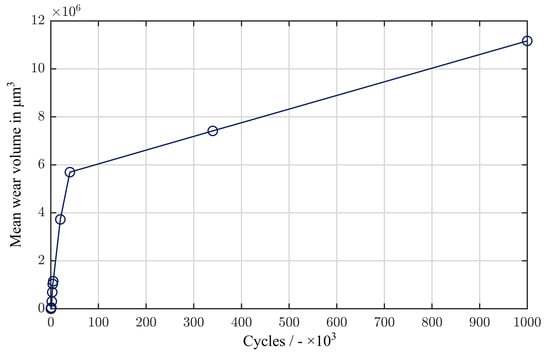 Figure 12 shows the wear volume calculation of several investigated wear marks and tested bearings at different numbers of cycles. The data points are the mean values of several wear marks investigated with respect to the associated amount of cycles. The graph is characterized by a steep increase in the wear volume of between 500 and 40,000 oscillation cycles. Further increasing the number of cycles does not lead to a significant increase in wear volume. Even after 1 million cycles, the characteristic wear volume only roughly doubled compared to 40,000 cycles. However, the number of tests conducted for such a large amount of cycles is limited, which makes the interpretation somewhat difficult.