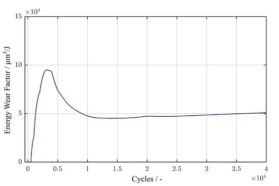 This results in the energy wear factor are shown in Figure 10. For the first 3000 cycles, which show no increase in torque, it is assumed that the grease lubrication is still effective in preventing wear in most contacts, so that . From this point on, there is a steep increase to a value of approximately at 10,000 cycles. Subsequently, degressively decreases until becoming almost constant after 80,000 cycles. The horizontal black lines are energy wear coefficients measured by Fouvry in a different test setup, which will be further discussed in Section 4.