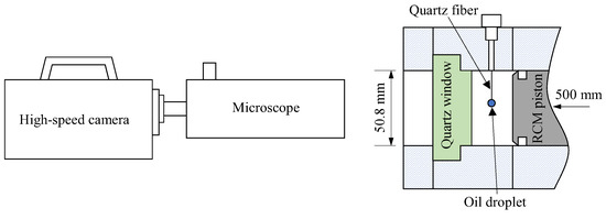 The experiments were conducted using a rapid compression machine (RCM), as illustrated in Figure 1. The RCM combustion chamber has a diameter of 50.8 mm and a stroke of 500 mm. By adjusting the clearance of the combustion chamber, different compression ratios (i.e., thermodynamic states at the end of compression, EOC) can be achieved. The end wall of the combustion chamber was fitted with a quartz window (D = 50.80 mm, the same diameter as the combustion chamber) to enable visualization of the entire combustion chamber. To capture the combustion process, a high-speed camera (Fastcam SA-X2, from Photron Ltd., Tokyo, Japan) was used. In cases where close-up observation of oil droplets in the combustion chamber was necessary, a long working distance microscope (QM-1, from Questar Corp., New Hope, PA, USA) was employed to provide high magnification ratios.