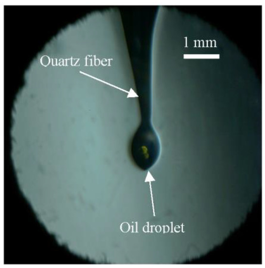 A lubricating oil droplet suspended at the tip of a quartz fiber.