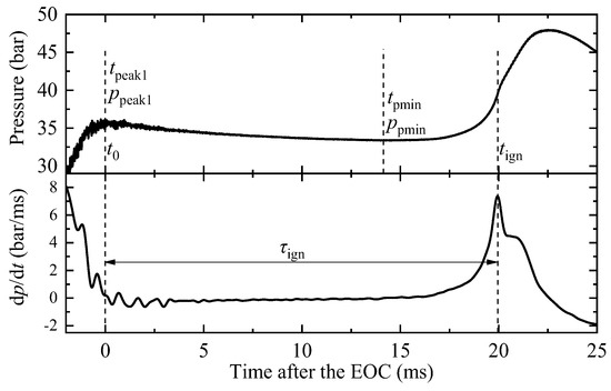 The ignition delay time of the ambient gas (τign in Figure 3) is defined as the interval from the EOC to the time when the pressure rise rate reaches its maximum.