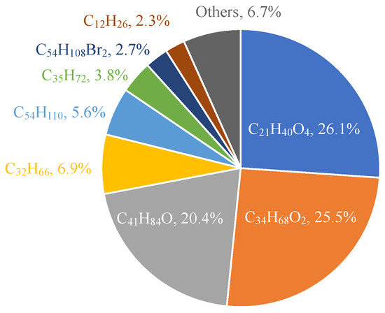 The lubricating oil used in this study was a commercially synthesized one for gasoline engines, which was consistent with our previous work [18]. The main components of the oil and their mass fractions are shown in Figure 4. Components with mass fractions below 2% (which account for a total of approximately 6.7%) are not presented. The carbon number ranges from 12 to 54, which is similar to the range mentioned in Ref. [20].