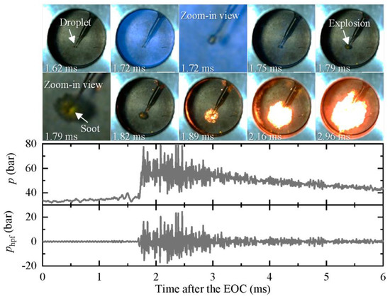 In a previous study, we reported that when an oil droplet is placed in a homogeneous charge compression ignition environment, it could explode if the ignition delay of the ambient gas is relatively short [18]. An example of such an explosion is shown in Figure 5, where a lubricating oil droplet explodes in a compression ignition environment with peff = 32 bar and Teff = 1090 K. The ambient flammable gas ignites homogeneously at 1.72 ms, and by this time, no noticeable change is observed in the oil droplet. At 1.75 ms, the blue flame generated by the homogeneous ignition of the ambient gas has almost completely disappeared. Then, yellow dots start to appear at the position of the oil droplet at 1.79 ms, indicating the generation of soot due to the burning of the oil vapor. As the burning continues, a flame-ball-like soot cloud is formed, expanding outwards from the original position of the oil droplet, similar to an explosion. The pressure trace reveals that the ignition of the ambient gas results in a strong pressure oscillation lasting for more than 1.5 ms, with a maximum pressure and amplitude exceeding 79 bar and 24 bar, respectively.