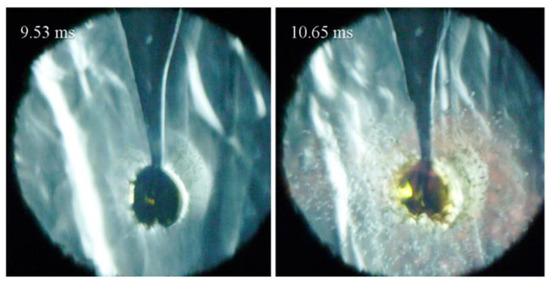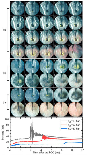 To examine the detailed process of the oil droplet explosion, we conducted microphotography with a long working distance microscope, as described in our previous study [18]. In Figure 6, we present images of 3 oil droplet explosion processes. In all 3 cases, the initial oil droplet volume was 1.0 μL (Deq = 600 μm), and the Teff of the ambient gas was around 1070 K while the peff increased from 13 bar to 31 bar.