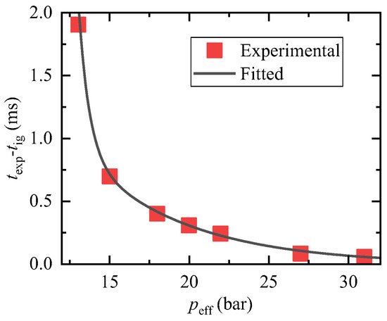 Upon comparing these three cases, it can be observed that as the effective pressure increases, the time difference between the droplet explosion (texp) and the ignition time of the ambient gas (tig) becomes shorter and follows an exponential pattern, as depicted in Figure 8. Moreover, the severity of the droplet explosion increases while the size of the droplets produced by the explosion decreases. Additionally, it can be noted that at higher effective pressures, the expansion of the oil droplet before the explosion becomes less significant.