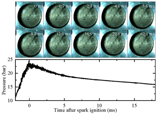 Figure 10 illustrates the development of the oil droplet under low-pressure spark ignition conditions (Case 2 in Table 1, peff = 10.8 bar, Teff = 701 K). To simulate the no-oxygen environment in gasoline engines, the equivalent ratio of the mixture was set to 1.2, and 20% additional nitrogen was added to suppress end-gas auto-ignition and pressure oscillation. The images depict that the flame front arrives at the oil droplet 4.7 ms after the spark timing, but the droplet does not ignite. Subsequently, the flame front propagates to the unburned mixture, creating a burnt no-oxygen environment for the oil droplet. During this period, the oil droplet does not change significantly. At 11.4 ms, a bright, small yellow region appears at the oil droplet, which is the soot cloud produced from oil pyrolysis in the no-oxygen environment. Afterward, the soot cloud moves with the gas flow but does not significantly expand into the surroundings, indicating that the oil droplet does not explode. This can be attributed to the large size of the oil droplet and the short duration of the high temperature, which does not allow the lighter components to reach their boiling points. Therefore, the high temperature generated by combustion does not significantly affect the oil droplet.