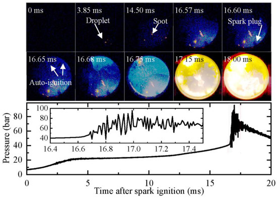 Figure 11 depicts the oil droplet development under medium-pressure spark ignition (Case 3 in Table 1, peff = 15.7 bar, Teff = 703 K). Compared to low-pressure spark ignition (Case 2), the peff is increased from 10.8 bar to 15.7 bar to enhance the possibility of generating stronger shock waves during combustion. At 6.0 ms after spark timing, the flame front engulfs the oil droplet, and no significant change in the oil droplet occurs. At 11.6 ms, soot formation starts on the droplet. However, the expansion of the soot region is not substantial in the subsequent process, and its expansion is primarily along the quartz fiber. At 15.3 ms, end-gas auto-ignition occurs near the combustion chamber wall, and the pressure rapidly rises with slight oscillation. Immediately afterward, a glowing soot cloud forms and continues expanding outward. This phenomenon is highly similar to the oil droplet explosion observed in Figure 5 and Figure 6.