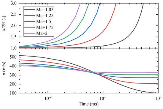 In this study, the variation of a and u with time for different Mach numbers is presented in Figure 13, assuming R = 300 μm, p0 = 40 bar, γ = 1.4, and c = 550 m/s. The major axis length is normalized in the form of a/2R. It is observed that the major axis length can increase to more than twice the initial diameter in less than 1 ms, even with a Mach number as low as 1.05. The increase in major axis length is significantly advanced as the Mach number increases, indicating that high Mach numbers accelerate the deformation of the droplet. This suggests that the droplet will explode more violently at higher Mach numbers, i.e., higher Δp, which is consistent with the experimental results presented in Figure 6, Figure 11 and Figure 12. As shown in Figure 13, the initial relative velocity decreases with increasing Mach numbers. This is because the initial relative velocity is the velocity post-shock wave, and according to Equation (4), the gas velocity post-shock wave decreases as Mach number increases. However, the decreasing trend of the relative velocity decreases with increasing Mach numbers. This is because, according to Equation (3), the relative velocity is inversely proportional to a. The increase in a is fast at high Mach numbers, so the change in relative velocity is relatively small.