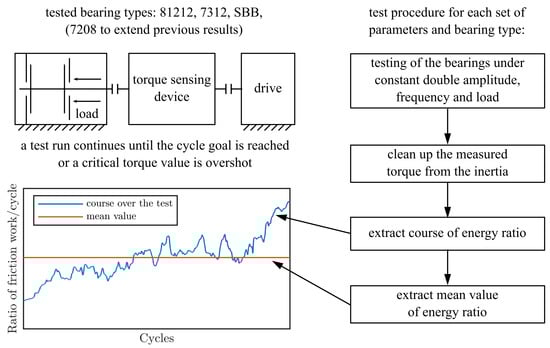 This section describes the basic testing procedure, the bearing types tested and the associated test rigs, as well as the evaluation of the obtained measurement data. Figure 1 summarises the experimental procedure graphically. Since the experimental concept for all of the four tested bearing types is the same, a brief general description is given before a more detailed explanation of each test rig follows. In all conducted experiments, the inner ring of the bearing is subjected to a sinusoidal motion by a drive, while the outer ring is fixed. The bearing is stressed by a constant load and lubricated by a defined amount of fully formulated industrial grease. Due to the design of the test rig, two bearings are always tested simultaneously. Both bearings experience the same operating conditions and should produce the same torque and wear, but it is not possible to distinguish their results in the measurements from the test rig. For all experiments, the same grease with the properties listed in Table 1 was used. To mimic different operating conditions, the drive is capable of performing the sinusoidal motion of the inner ring with different frequencies f and double amplitudes . Both are kept constant during one test run. During the experiment, the rotation angle of the inner rings and the drive torque of the bearings are recorded by corresponding measurement devices. An experiment continues until a predefined number of oscillation periods is reached or until a critical drive torque is exceeded. Load and experimental parameters for all bearing types are shown in Table 2.