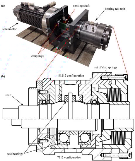Point contacts on a small scale were tested by the use of ACBBs with the designation 7208 identical to Wandel et al. to complement their experiments. The appointed test rig is described in more detail in their publication []. To compare between line and point contact, CRTBs with the designation 81212 were tested on the test rig depicted in Figure 2. Aside from the bearing unit itself, it is identical to the rig used for the 7208 bearings. A backlash-free-coupled servo motor subjects the bearings to sinusoidal oscillation. A torque measurement shaft between the motor and the shaft of the test unit records the inner ring rotation angle and torque. The test unit for the 81212 bearings is a modified version of the FE8 testing machine [] and consists of two CRTBs as test objects and two radial support bearings that bear the weight of the shaft. The test bearings are centrally loaded with an axial force applied by compressing a set of disc springs under a hydraulic press. A load cell during pressing enables one to set the desired axial force. To test the 7312 bearings, the same test unit with different bearing supports is employed. The 7208, the 7312, and the 81212 bearings are all unsealed. The grease is applied on the raceways during assembly. Before applying the sinusoidal motion of the actual test to the small-scale bearings (7208, 7312, 81212), a short rotational run-in at 10 rpm takes place for two minutes to distribute the grease in the bearing. The maximum contact pressure in all small-sized bearings is 2 GPa. The relative measurement uncertainty of the torque measuring shaft is for the small-scale bearings.