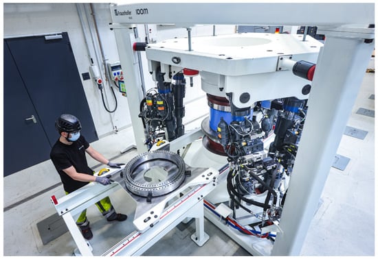 The 4-point contact double-row bearings are tested on the BEAT1.1 (Bearing Endurance and Acceptance Test Rig 1.1) (see Figure 3). These bearings are smaller than modern blade bearings, but built with the same topology. In addition, the manufacturing processes are the same as for real-scale blade bearings. Hence, the surface finish, hardening processes and the overall stiffness of the bearings are comparable with real blade bearing applications. They also have a similar sealing technology to the large-scale bearings. Therefore, they are referred to as scaled blade bearings (SBB) in the following. The BEAT1.1 makes use of a hexapod construction and is able to apply loads at six degrees of freedom. Therefore, the design is particularly suitable for emulating load conditions that are typical for blade bearings of wind turbines. The test rig tests two bearings at the same time in back-to-back configuration. The inner rings of both bearings are coupled with a force-transmitting element, which also holds a gearing and is connected to an electrical pitch system. This system consists of a gearbox, a torque meter and an electric motor to enable the turning movement of the bearings’ inner rings. Thus, not only the torque of the bearings is measured but also the friction torque from the gearbox. To obtain measurements dedicated to the bearings, the measured torque has to be adjusted to eliminate the influence of the gearbox. A detailed description of this procedure is given in []. After assembling two test bearings to the test rig, each pair of bearings is tested with three different test programs to assess their individual friction torque properties. These test programs perform a total of 454 movements with at different speeds and load conditions. In addition to the friction torque evaluation of the undamaged bearings, these test programs are considered a suitable running in the procedure. Hence, the grease is properly distributed, and each segment of the raceways and each rolling element has undergone some overrollings before the wear-relevant cyclic test program with sinusoidal movements is applied to the bearings. In contrast to the experiments with the smaller bearings, a static bending moment is applied to the test bearings instead of a static axial force. The bending moment is set to = 150 kNm, which leads to a maximum pressure of 2.5 GPa in the compression and traction sides of the bearing. The idea behind this test set-up is to achieve a nonuniform load distribution on the raceways to be able to study the influence of the contact pressure on the wear development. All information given with respect to the scaled blade bearings and oscillating movements will focus on the contact properties and ratios determined at the highest contact pressure.