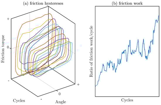 By plotting the friction torque over the rotation angle for each period of the sinusoidal angle signal, one can obtain hysteresis loops such as in Figure 4a. A test run with n cycles will yield n hysteresis loops correspondingly. Since considering all loops for each experiment individually is cumbersome when it comes to comparing the results of different experiments, a more practical variable is desirable. The framed area of one hysteresis corresponds to the dissipated energy in one cycle. Since the goal of this investigation is to assess the influence of the oscillating parameters on the wear initiation and lubrication, the dissipated energy of one cycle is a suitable variable for evaluation. To make a comparison between different bearing types more accessible and to compensate for possible inaccuracy in applying loads, the values of the dissipated friction work/energy per cycle are normalised by the mean value of the dissipated energy of the first fifty cycles. An example of a plot of this energy ratio over the course of an experiment is shown in Figure 4b. To smoothen outliers, a running median with a window of twenty is applied to the energy ratio values of the small-scale bearings. For the SBB, a low-pass filter with a cutoff frequency of 25 Hz is applied to the torque measurements to cut out the influence of higher frequencies originating from the gearbox. The results for different oscillating conditions will be presented in the form of graphs of the friction work ratio.