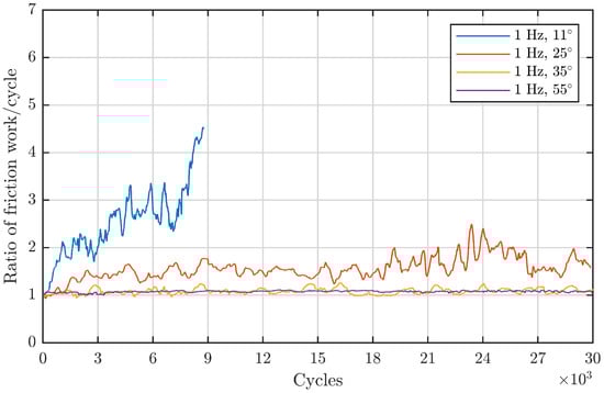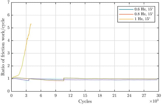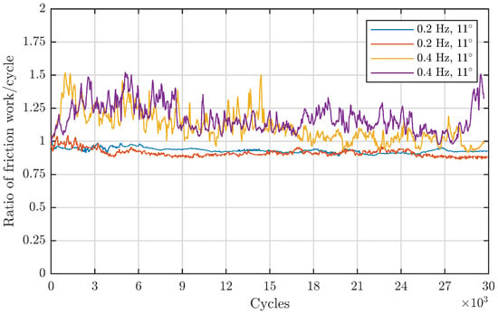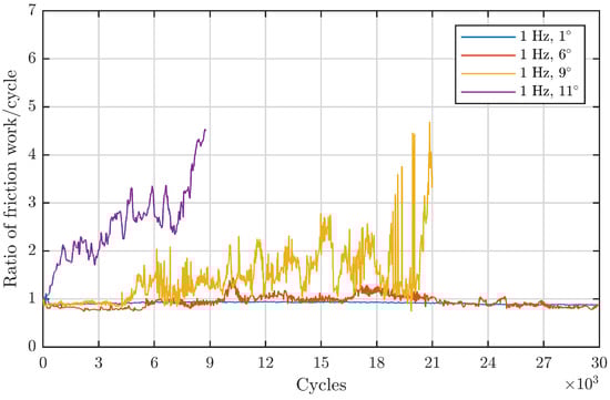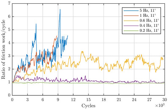 Figure 5 shows the development of the energy ratio over 30,000 cycles for oscillation frequencies from 5 down to 0.2 Hz for an oscillation angle of 11. The tests with 1 and 5 Hz almost immediately show a steep incline of the energy ratio and therefore also the general torque level. To protect the torque sensing shaft from high oscillating loads, the runs are aborted before the cycle goal of 30,000 cycles is reached. After 9000 cycles each, the experiments at 1 and 5 Hz show an energy ratio above four, i.e., the dissipated energy of one cycle quadrupled in comparison to the average of the first fifty cycles. For 0.6 Hz, the energy ratio seems to reach a quasi-steady state at a ratio of 2.5 with peaks up to 3 and minimums of 2. For 0.4 Hz, the ratio first rises to a maximum value of 1.5 and then starts to drop in the remaining cycles to a magnitude of approximately 1. Compared to the previous higher frequencies, the energy ratio shows fewer fluctuations in the course of the experiment. For an oscillation frequency of 0.2 Hz, there is no visible change in the ratio; it stays close to unity and experiences few fluctuations compared to the previous runs.