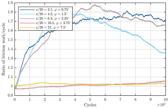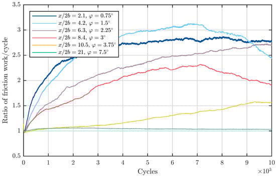 According to Equation (8), a constant maximum entrainment velocity, such as in the downscaled blade bearing experiments, corresponds to a constant risk of the contact running dry and therefore also damage initiation in the first regime. In this form, Figure 10, Figure 11 and Figure 12 are more clear with regard to the angle behaviour described by the oscillating grease starvation theory by Wandel et al. Starting with in Figure 10, the graphs for the first three double amplitudes , , and are nearly the same. This complies with the starvation number for a constant entrainment velocity (Equation (8)) and indicates that these three double amplitudes/ ratios lie within the first regime. For the two remaining amplitudes of and in Figure 10, the friction energy ratio stays as one throughout the course of the experiment, although the entrainment speed remains constant. This can be explained by the second or third regime of the starvation number, which is numerically represented by lower values or zeros in these regimes. Physically spoken, these values greater than are believed to correspond to an immersion of the rolling element into grease reservoirs present close to the pockets of the cage. Hence, there is the possibility of grease and base oil being dragged into the contact and thus preventing damage initiation.