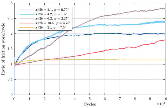 Looking at the greater entrainment velocity of in Figure 11, generally higher values of the energy ratio are visible. This corresponds to a higher starvation number due the increased speed (see Equation (8)). The previous observation of nearly identical energy ratio curves for low double amplitudes does also apply in this case. For the double amplitudes of , , and , the curves of the energy ratio are similar. Therefore, these double amplitudes can be located in the first regime. The double amplitudes and exhibit lower levels and therefore belong in the second regime. For a speed of , the double amplitude of did not exhibit any friction energy rise. This can be explained by the rise in velocity and, therefore, also starvation risk by means of the starvation number in the second regime. Again for a double amplitude of there is no rise in the torque signal, which supports that this amplitude is located in the third regime. For the highest entrainment velocity of , the findings of are generally confirmed. The only discrepancy is that the energy ratios in the first regime are a bit lower than for the previously discussed speed of . It should be mentioned that the starvation number is primarily intended to predict the general occurrence of starvation and therefore also rise in friction energy. However, the magnitude of the friction energy over the cycles is also dependent on the wear development involving possibly more factors. However, the starvation theory presented by Wandel et al. showed good performance in explaining the results of the SBB and 81212 with respect to the influence of the double amplitude . A direct comparison with further literature is difficult since there are no other known studies incorporating torque measurements in combination with a systematic variation of the double amplitude. Phaner-Goutorbe et al. could not find a direct difference in the wear progression with double amplitudes ranging from to []. Their judgement was based on surface changes only under consideration of significantly higher frequencies of up to 20 Hz. A broader evaluation of the test is not available. Furthermore, a direct link between the change in surface roughness and friction torque is not reasonable, as can be seen by Wandel et al. []. After the initiation of damage by a lack of lubricant, several wear mechanisms can occur in succession. If after a first adhesive phase, abrasion sets in, the surface roughness will even decrease again, even though a significant rise in friction torque occurred. For this reason also, the results of Maruyama et al. are not directly comparable to this investigation, although they show the same behaviour regarding the double amplitude in the first regime with their low-viscosity base oil grease [].