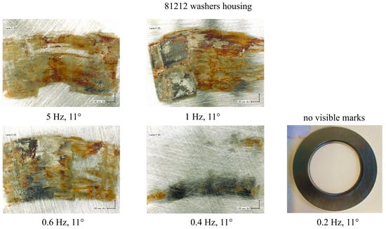Figure 13 shows the condition of the 81212 CRTB washers after the test. As an example, the washers corresponding to Figure 5 with a double amplitude of are shown. For all parameters except a double amplitude of and 0.2 Hz, damage in the form of red oxides and surface craters is visible. The extent of the damages appears to decrease with lower frequencies.