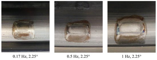 Figure 14 shows images of wear marks on the scaled blade bearing raceways for a double amplitude of and increasing frequency. The images are taken from wear marks located in the highest loaded areas of the bearings. For all test conditions, wear is clearly visible. With increasing frequency, the wear marks appear shinier and show fewer signs of tribo-corrosion (red oxides) and micropittings, which could be an indicator of a faster wear progression throughout the test, as abrasive wear mechanisms seem to lead to a more polished appearance.