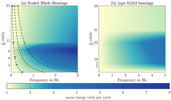 In summary, the presented results for the investigated bearing types agree with the results by Wandel et al. regarding the wear initiation in dependency of the double amplitude and oscillation frequency [,]. They summarised their work in “colourmaps” that show the frequency on the abscissa, the double amplitude on the ordinate, and represented torque using a colour scale. Figure 15 uses the same concept to summarise the results for the SBB (a) and the 81212 bearings (b), but instead of using the maximum torque, the average energy ratio of the test is used. In further contrast to the maps of Wandel et al., not the whole grid shown in the maps was covered by experiments. Hence, the data for the maps were obtained by linear regression for a constant double amplitude and subsequent linear interpolation between this regression data for a constant frequency. For the 81212 bearings, additional experiments were completed near the critical starvation number to have a larger amount of data. The parameters of the additional experiments are given in Table A1. For the SBB, the lines of constant speed are indicated as well. The maps confirm the previous discussion of the results and show the different regimes of the double amplitude and the frequency influence.
