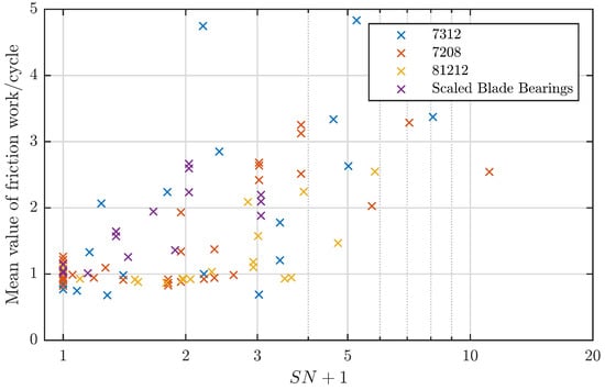The experimental results of the bearing type 7312 can be found in the Appendix A in Figure A1–Figure A5. They are not described in detail since they do not exhibit a new distinctive feature compared to the 7208 bearings of Wandel et al. except their larger ball diameter. Nevertheless, they are interesting for the broader evaluation, following in the next chapter, to obtain a larger amount of data for validation.