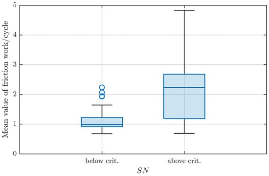 For a more quantitative analysis, the starvation numbers for the SBB, the 81212 bearings and the additionally tested 7312 bearings were calculated. To determine the x-thresholds of the second and third regime, the highest and the lowest value of the regimes identified by the energy ratio were used (details in Table A2). In Figure 16, the mean value of the energy ratio for each test is plotted over the calculated starvation numbers (1 was added to the SN to enable logarithmic scaling). For reference, the 7208 tests of Wandel et al. with the same grease as used here are also included. Although there is some scatter in the data, it is noticeable that most of the experiments with low energy ratios also show low starvation numbers and vice versa. By defining a critical energy ratio of , i.e., to tolerate a maximum increase in friction energy by 40%, and assuming a critical starvation number of , a classification error of 22% is obtained. Table 5 shows the corresponding data. In Figure 17 this critical starvation number is used to classify all the experiments and show the results again in the form of a boxplot. Although there are some outliers for SN-values below the critical limit that show an energy ratio in the magnitude of two, the general performance is satisfying especially when fluctuations typical of grease-lubrication are considered. It shows that the oscillating grease starvation number proposed by Wandel et al. [,] based on experiments with only one small-scale bearing type and different greases also seems to be a valid tool to detect possible wear in critical operation conditions also for different contact geometries and larger bearings.