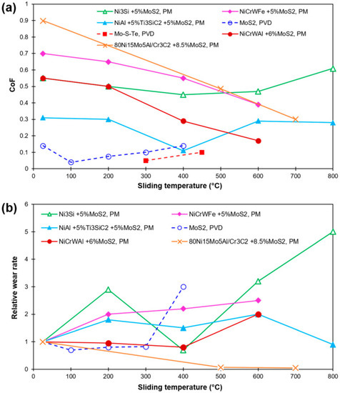 | Kong, Lingqian, et al. [128] | ZrO(YO)-Mo | Oxides | 5 wt% CuO | Ball-on-disc; alumina; load: 10 N; test time: 30 min; speed of sliding: 0.2 m/s; condition: 700 °C to 1000 °C | From 700 °C to 800 °C, 5 wt% CuO showed outstanding wear resistance properties. The creation of CuO and MoO can improve the tribological properties with lower friction coefficients 0.18–0.3 from 700 °C to 1000 °C. |