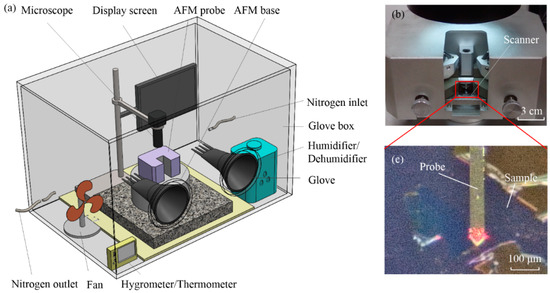 Experimental equipment. (a) Three-dimensional view of the experimental equipment. (b) AFM scanning probe. (c) Adhesion-force measurement area.