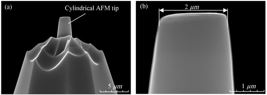 Figure 2 shows the cylindrical AFM tip SEM. The probe type is SD-PL2-CONTR, and the materials of tip and cantilever are silicon. The laser-reflection surface of the probe cantilever was coated with a 30 nm aluminum layer, which could completely reflect the laser into the laser receiver. From the enlarged view in Figure 2b, it can be seen that the diameter of the cylindrical tip is 2 μm.