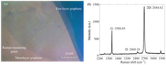 Optical schematic diagram of graphene under polarizing microscope and Raman spectrum diagram of monolayer graphene. (a) Schematic optical diagram of graphene sample under polarizing microscope. (b) Raman spectra of monolayer graphene.