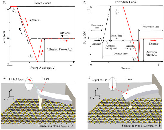 The adhesion force can be calculated by the force curve (see Figure 4a), and the force–time curve can know the running process of the AFM measurement (see Figure 4b). The force curve was measured by detecting the laser displacement, and the displacement of the probe cantilever and the adhesion force were obtained. The black lines in Figure 4a,b represent the sample approach process of the AFM probe. The sample moves upwards to cause the AFM probe cantilever to bend upwards, and the maximum Z-direction voltage was maintained until the set dwell time was reached (see Figure 4c). The red lines in Figure 4a,b represent the separation of the scanner and the probe. The sample moved downwards and the probe began to separate from the sample. During the separation process, the adhesion force made the AFM probe cantilever bend downward, and the force curve appeared as a large negative value (see Figure 4d). Contact time includes: approach running time, dwell time, and separation running time. It should be noted that during the approach running time, the cylindrical probe was in contact with the sample surface, the condensation of water was initiated, and the AFM would not collect data within the dwell time.