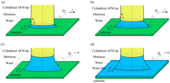 Figure 5 shows the change in meniscus and variable-water-contact-angle (VWCA) between the AFM cylindrical probe and the sample. θ1 is the VWCA of the cylindrical probe, and θ2 is the VWCA of the sample surface. Figure 5a shows that θ2 and the Kelvin radius r remained unchanged, and the meniscus was formed by condensation at the periphery of the cylindrical. The initial angle of θ1 was 90° and it gradually decreased with the increase in the meniscus. An increased meniscus results from water condensation [42]. As shown in Figure 5b, the center of the Kelvin circle moved horizontally outward until the Kelvin circle was tangent to the cylinder (see Figure 5c). After forming a complete meniscus, as the dwell time increased, the sample surface continued to condense to form a water film [43], leading to θ2 increase (see Figure 5d). In general, the thickness of the water film depends on the RH and hydrophilicity of the substrate [44,45].