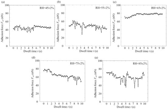 Figure 7 shows the variation rule of graphene adhesion force with the dwell time at different RH under cylinder–plane contact. It was shown that when RH was 45% and 55% (see Figure 7a,b), the adhesion force value was small (40–50 nN), which tended to be stable. When RH was 65%, the adhesion curve showed a significant increase in dwell time, and had a maximum value and stabilized (see Figure 7c). The maximum adhesion force was 80.58 nN, which increased by 29.78% when RH was 55%. When RH was 75–85% (see Figure 7d,e), the adhesion force curve slowly decreased and finally stabilized.